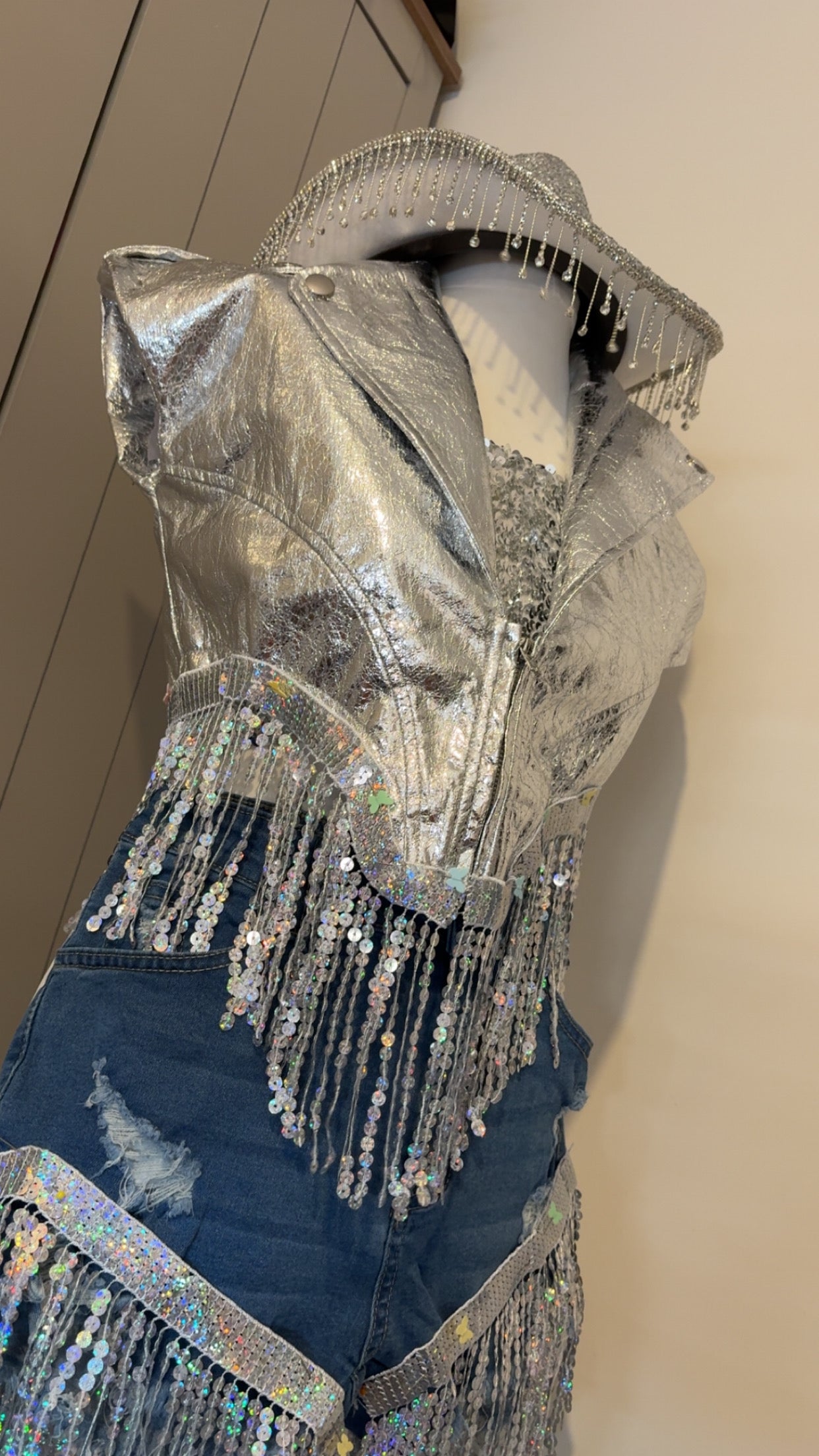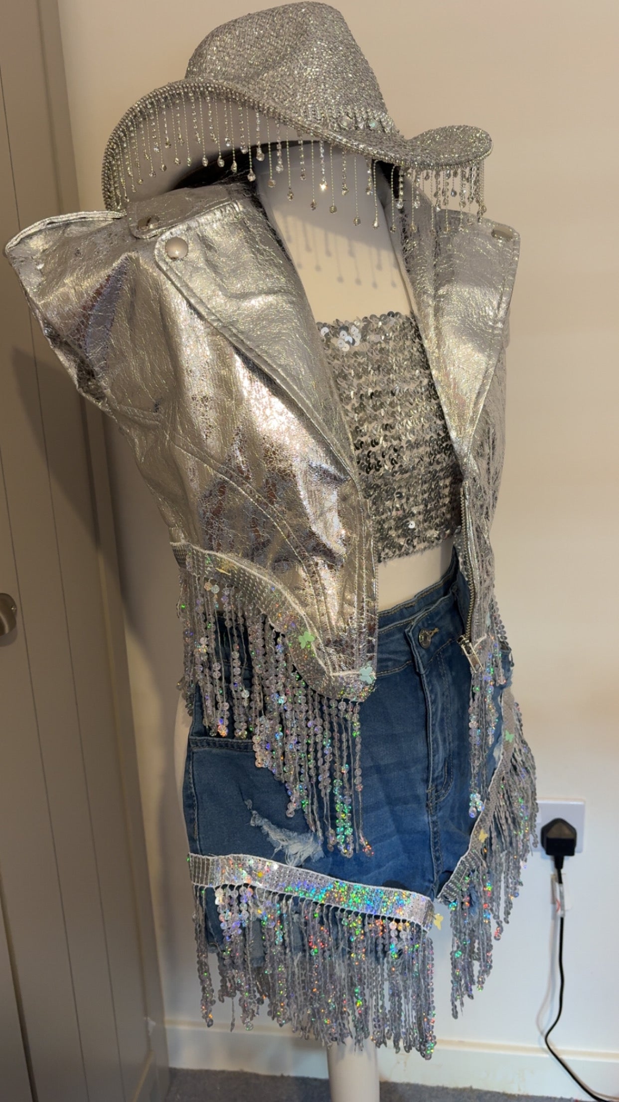 This full set includes Jacket, sequin tube top, hat, tassel trim shorts, silver cowgirl boots, arm pieces with tassels, and silver buckle belt. We are very limited to one set in each size as one off designs.
