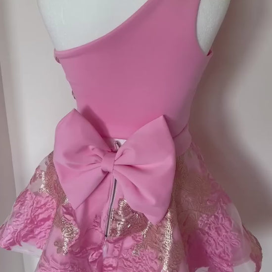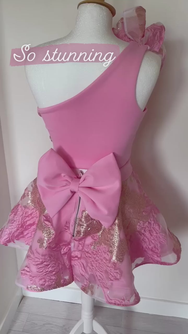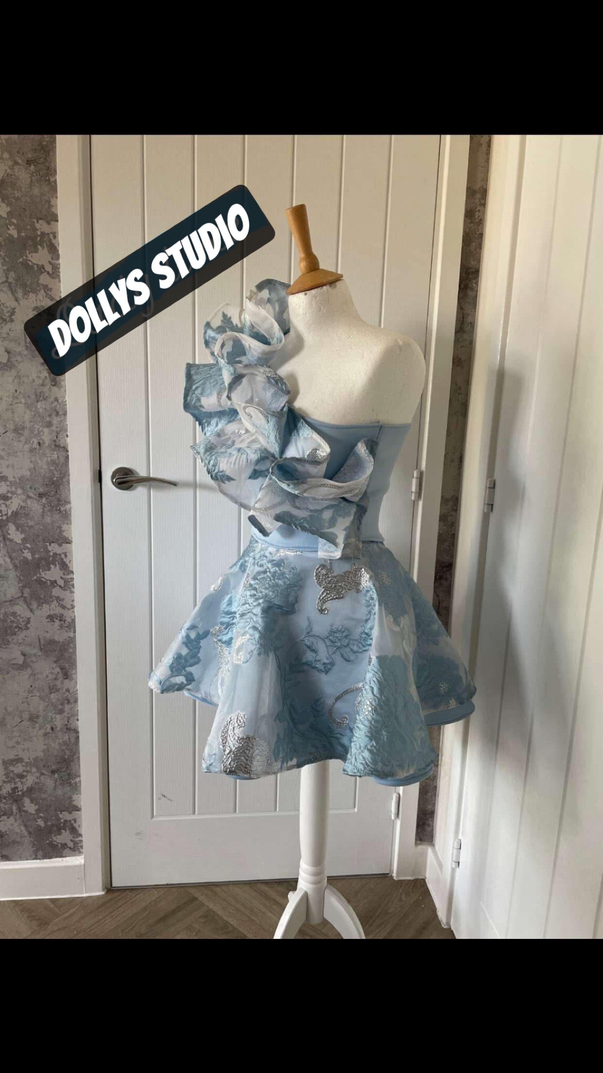 One shoulder top with skater skirt. Has a zip to the back of the skirt. Bow can be added to the back of the skirt.